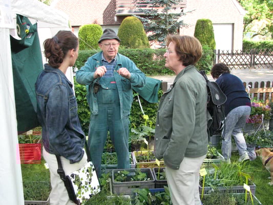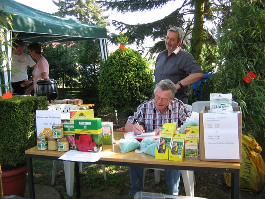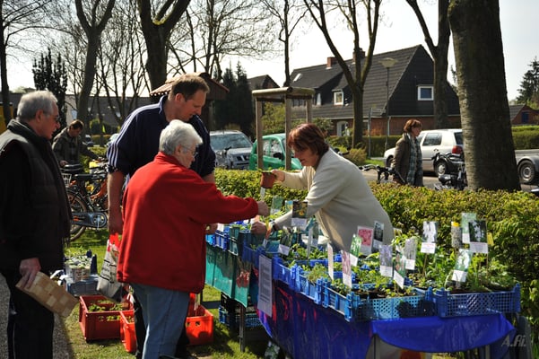 Hier bieten Siedler, Siedlerkinder und Hobbyzüchter ihre selbst gezogenen oder geteilten Pflanzen an. Auch werden Dünger, Vogelhäuser und verschiedene andere Dinge angeboten. Darüber hinaus bietet der Verein in Kooperation mit unserem Mitglied Jürgen Timmermann von Blumen-Timmermann ein großes Angebot einjähriger Bepflanzung und Stauden an.